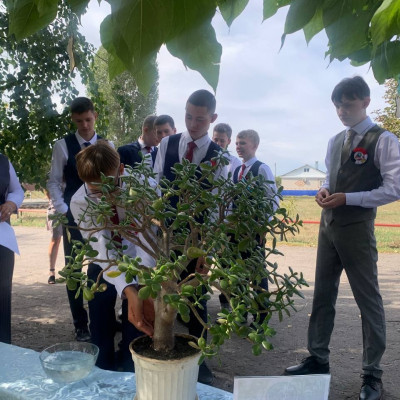 Участники акции набрали воду из чаши в ладони и поливали из рук комнатные цветы, таким образом, символически делились водой с теми, кого уже нет. Ведь именно цветы, принесённые ребятами на торжественную линейку, многим спасли жизнь.