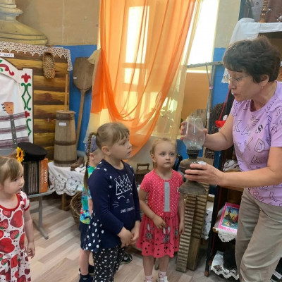 Дети увлеченно слушали и рассматривали экспонаты. Многие старинные вещи они видели впервые, поэтому они с большим интересом разглядывали и пробовали их на ощупь