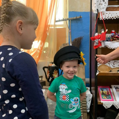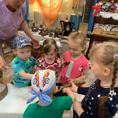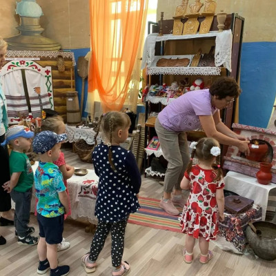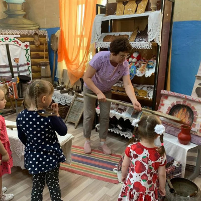 Ребята познакомились с интерьером крестьянской избы, домашней утварью и её назначением. Приходя сюда, ребята как будто погружаются в те времена, когда были в избах печи, и люди, готовили в них еду; когда вместо металлических ложек были деревянные; когда не было кастрюль, а использовали чугунки; когда не было швейных машинок, а в избе стояла прялка.