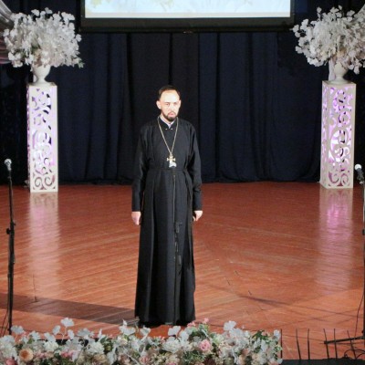 Перед началом праздничного мероприятия в малом зале РДК настоятель храма Иконы Казанской Божией Матери отец Силуан провел молебен святым Петру и Февронии.